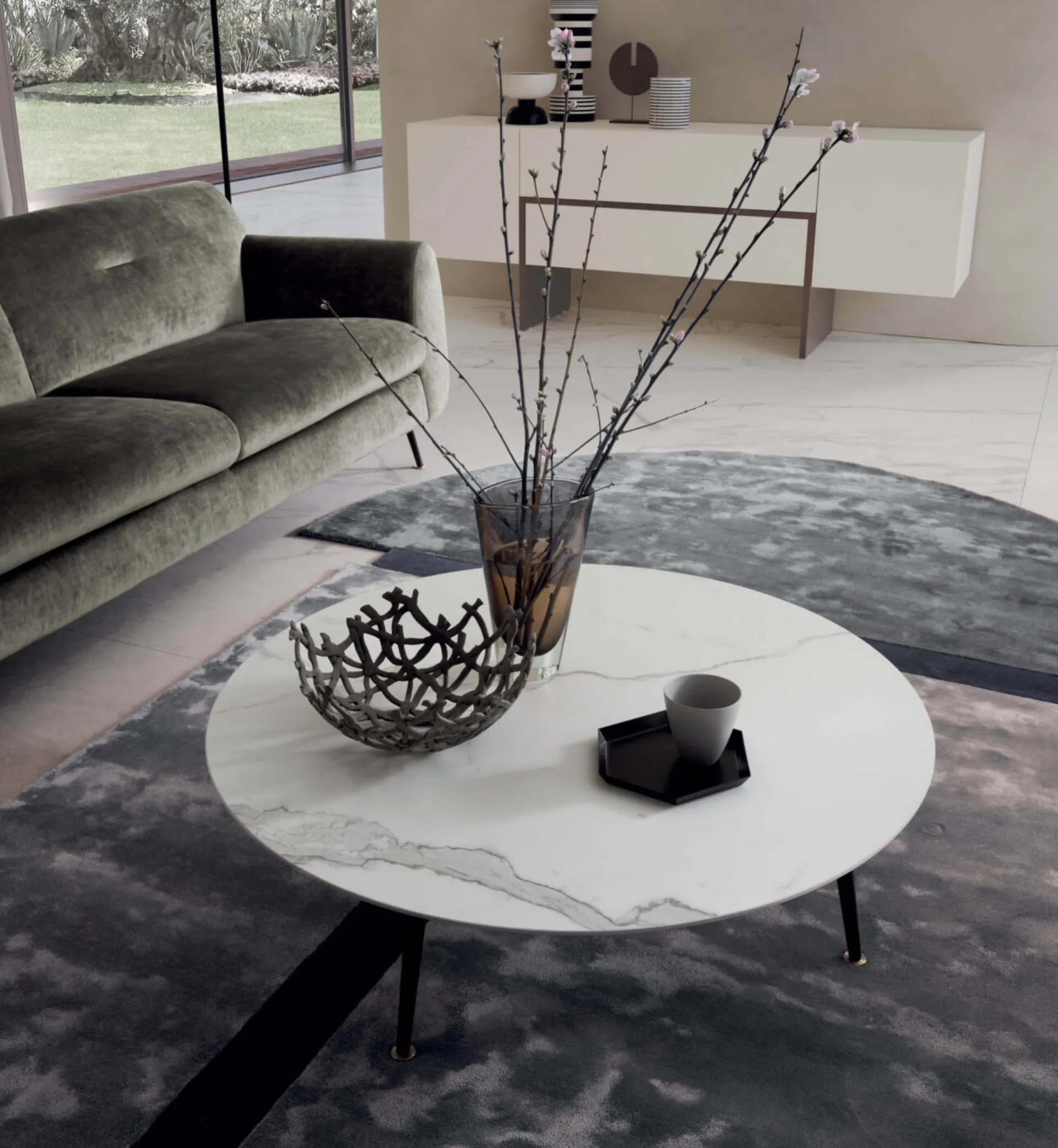Le composizioni arredative di charme del marchio Presotto arredano l'ambiente con colore e gusto, ricreando particolari atmosfere arredative. Particolarmente versatili e multifunzionali, i Complementi moderni in ceramica svolgono funzioni differenti: ultimano le doti pratiche e il valore estetico dell'ambiente. In negozio potrai vedere dal vivo la qualità dei modelli di tavolini moderni in ceramica del brand, proprio come questa proposta in foto. Complementi e tavolini completano l'arredo di casa, occupando lo spazio in maniera utile e rendendolo accogliente e di grande valore estetico. Tavolino rotondo Olive di Presotto in ceramica: darà carattere e fascino a un interno arredato con mobili e complementi dai richiami moderni.