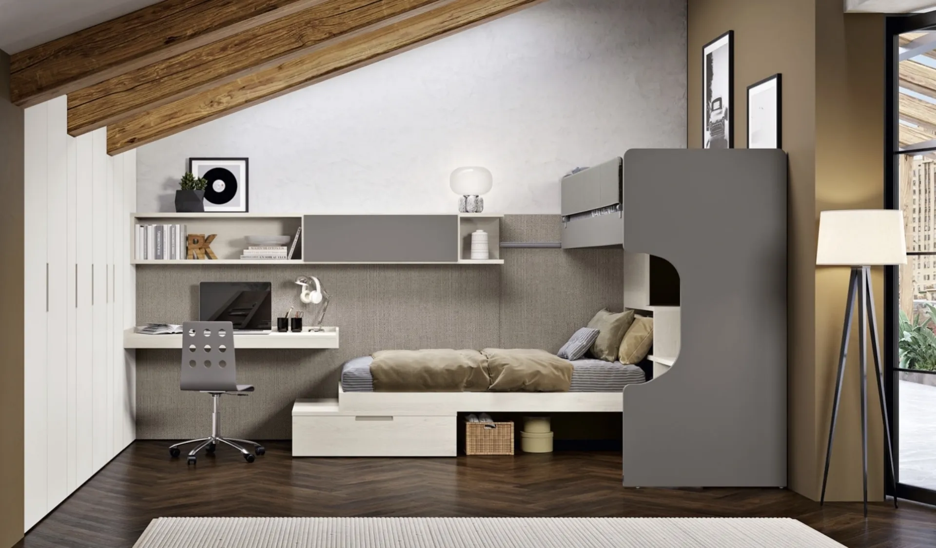 Ferrimobili asseconda il gusto dei giovani e le richieste degli adulti con le sue Camerette moderne con letti a castello, ideali per esigenze di ogni tipo. Vieni in negozio e potrai toccare con mano tutte le più belle composizioni d'arredo con letti a castello moderne di Ferrimobili per i più piccoli. Con una composizione arredativa Ferrimobili, potrai completare con funzionalità e design lo spazio in cui i tuoi figli passano gli anni più importanti della vita. Tonalità di tendenza e soluzioni progettuali ad hoc contraddistinguono le più belle composizioni del rinomato brand che presentiamo in negozio. La Cameretta 112 di Ferrimobili in melaminico è un universo complesso da organizzare con attenzione, coniugando vari accessori su misura.