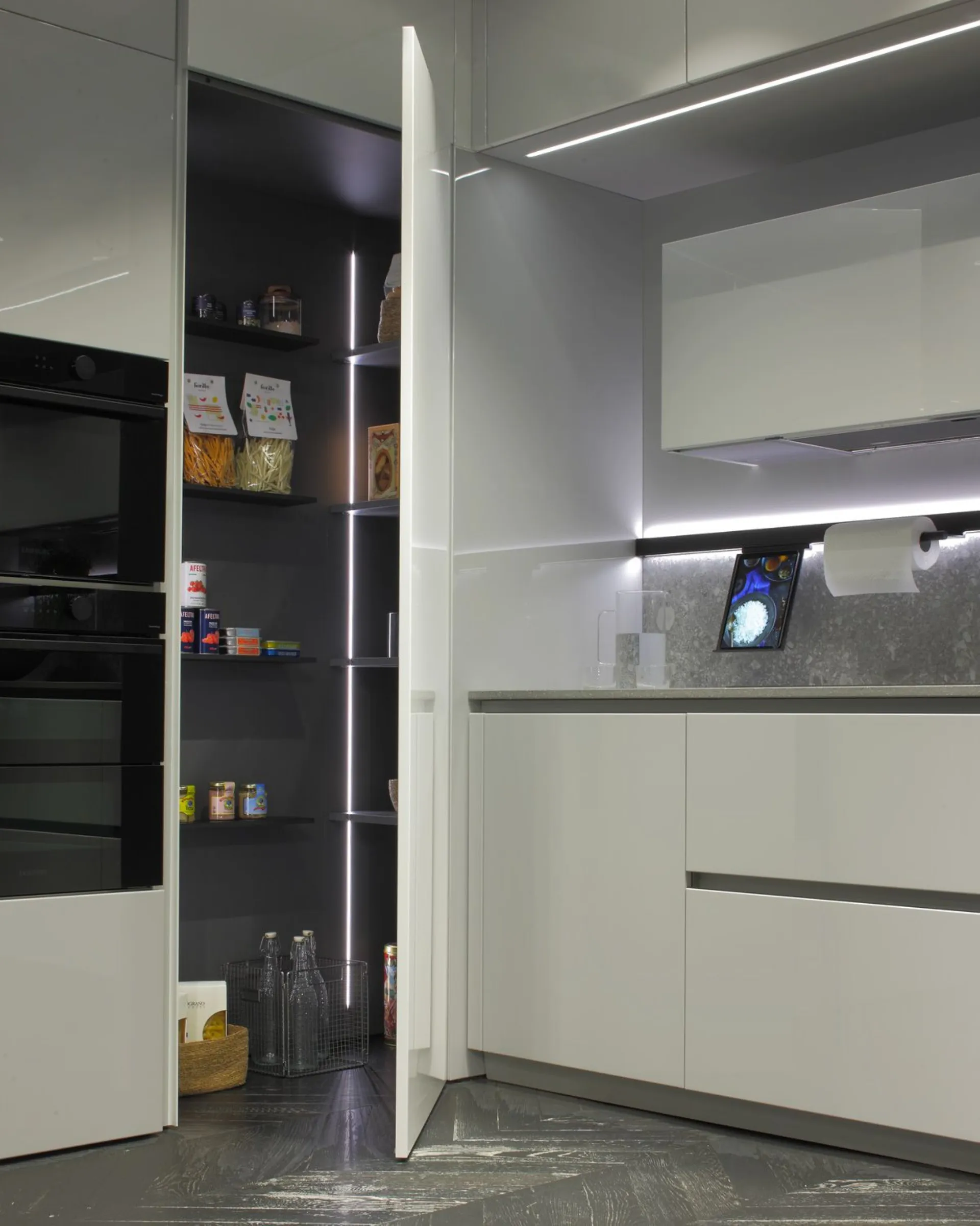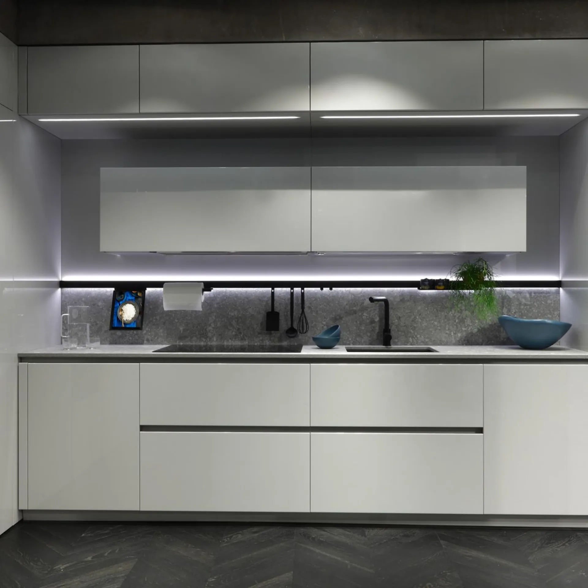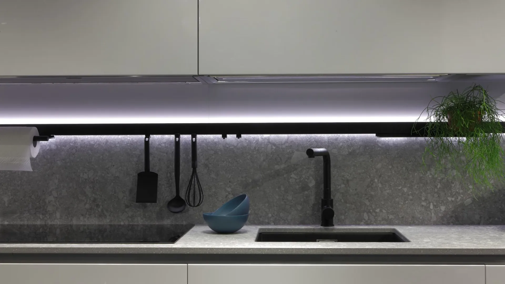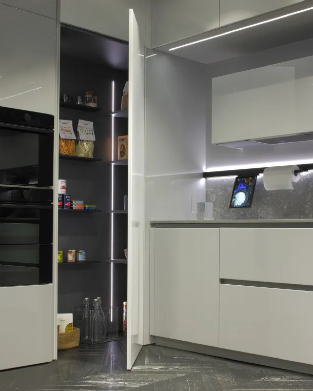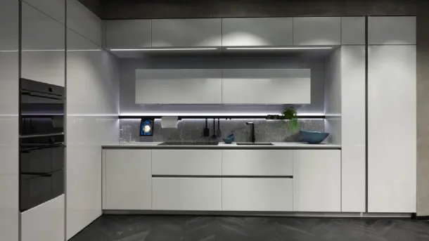 Cucina mod. Trend 30° laccata lucida grigio chiaro con profilo nero, H 266 cm, prof. 64 cm, piano e schienale in gres pietra Iseo naturale.