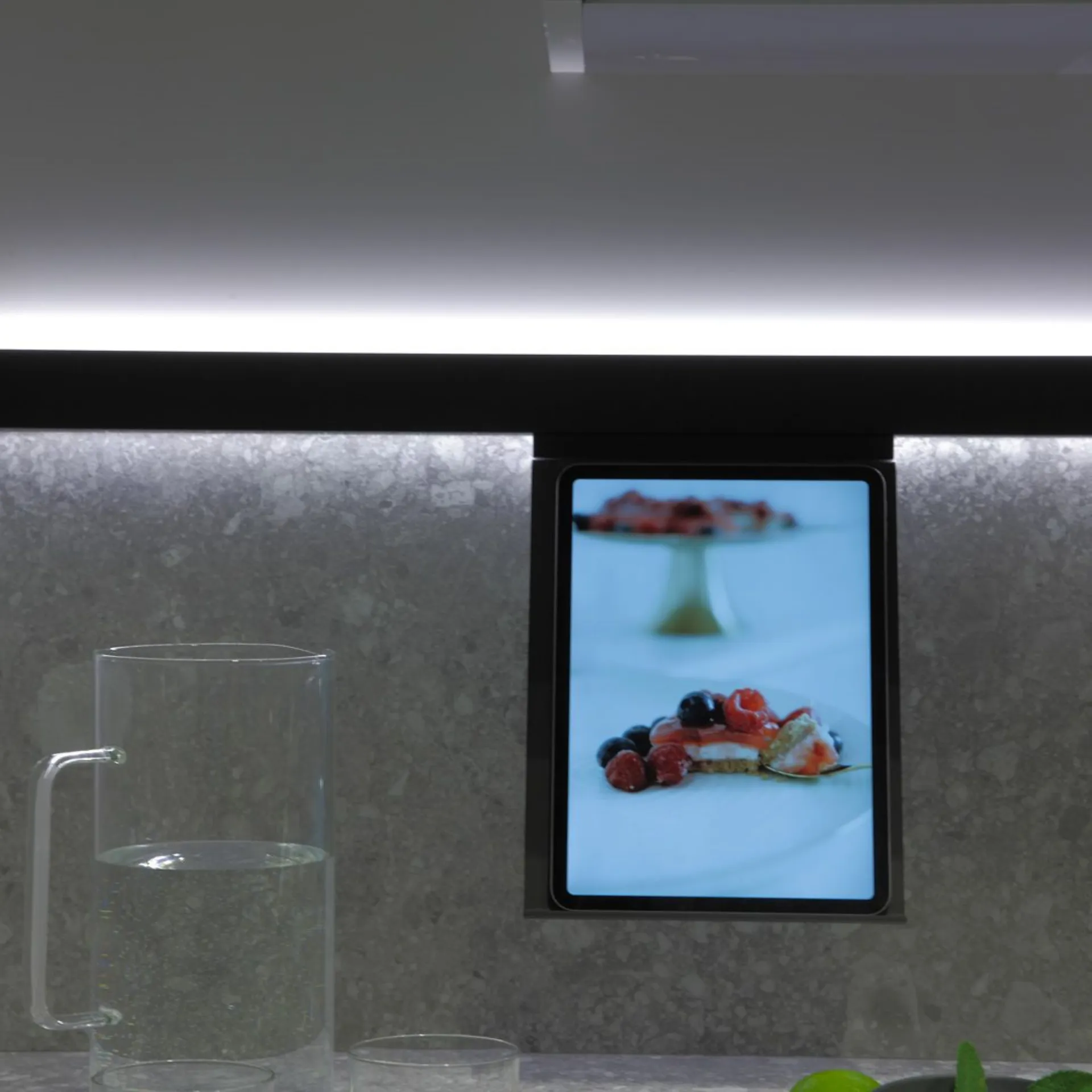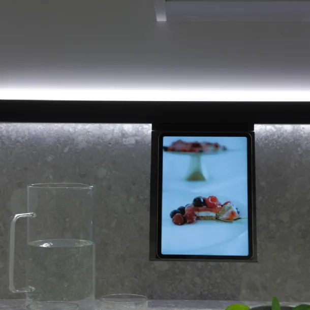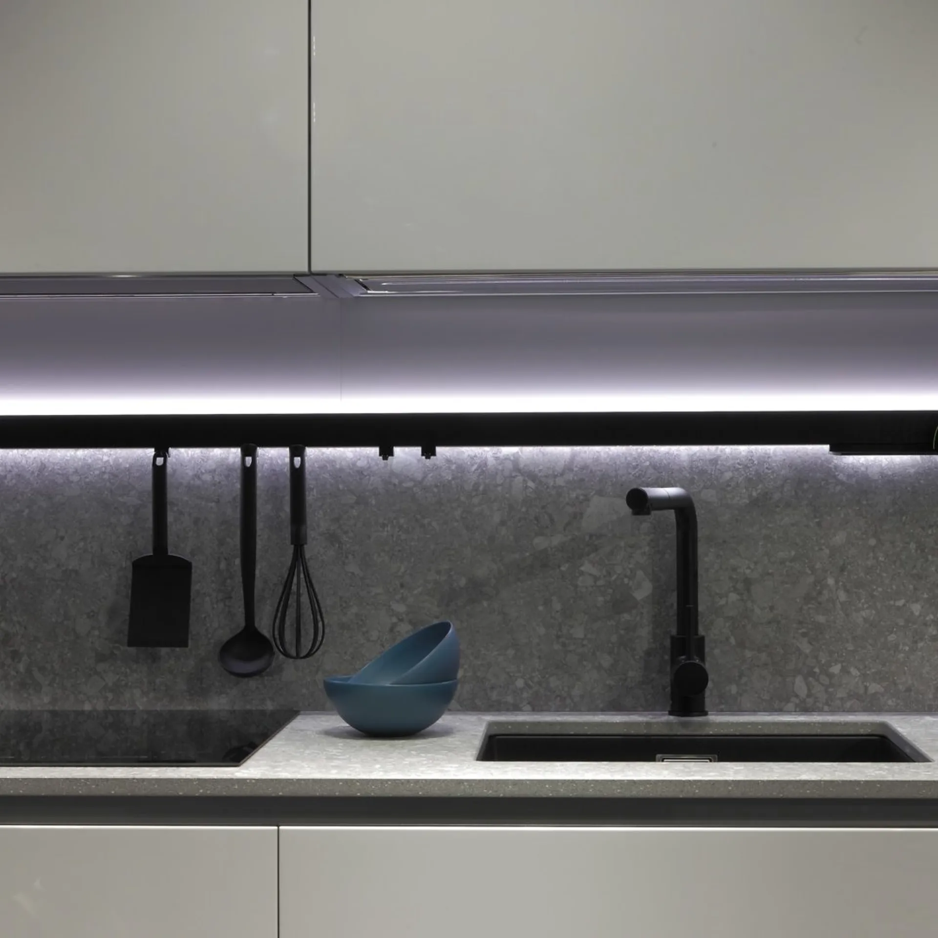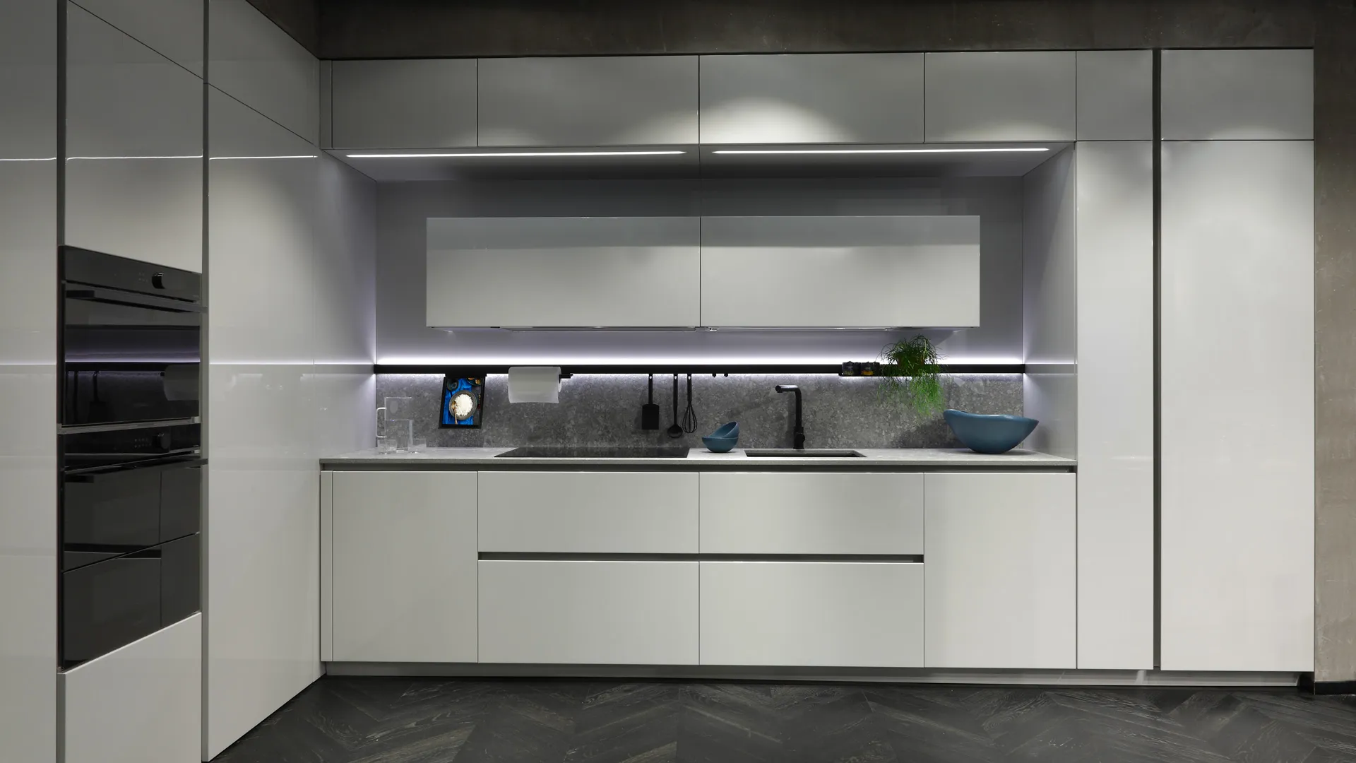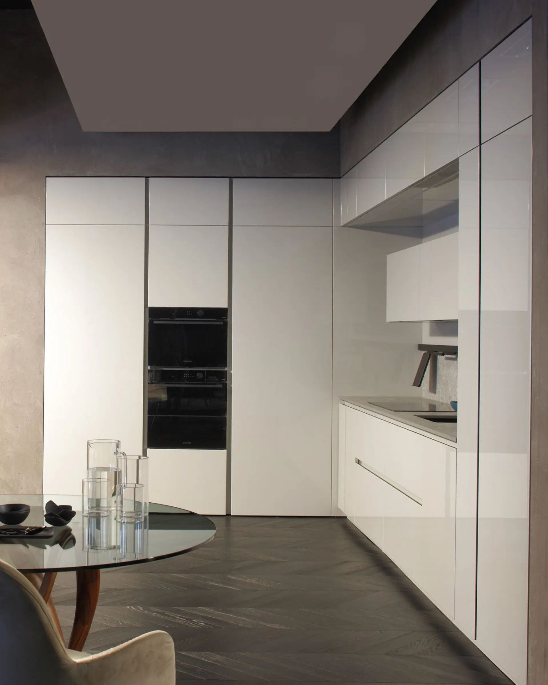Cucina mod. Trend 30° laccata lucida grigio chiaro con profilo nero, H 266 cm, prof. 64 cm, piano e schienale in gres pietra Iseo naturale.